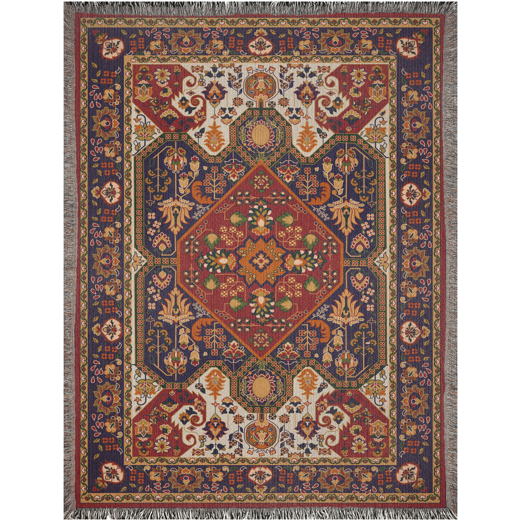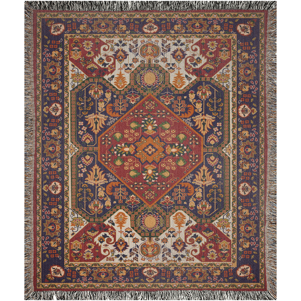Experience the opulence of Persian artistry with our luxurious 100% cotton woven jacquard loom blanket, adorned with a richly detailed geometric pattern in warm reds, golds, and browns. This exquisite design, inspired by the timeless elegance of Persian rugs, brings a touch of sophistication and warmth to any setting. Perfect for adding a decorative accent to your living room or for snuggling up on cooler evenings, this blanket combines cultural beauty with functional comfort. While it boasts the intricate patterns and colors of a classic Persian rug, this piece is intended for enjoyment as a soft, cozy blanket rather than a floor covering. It's an ideal choice for those who appreciate the blend of traditional art and contemporary living, offering a piece of historic charm in a modern, practical form.