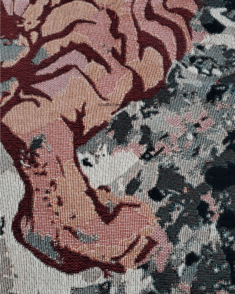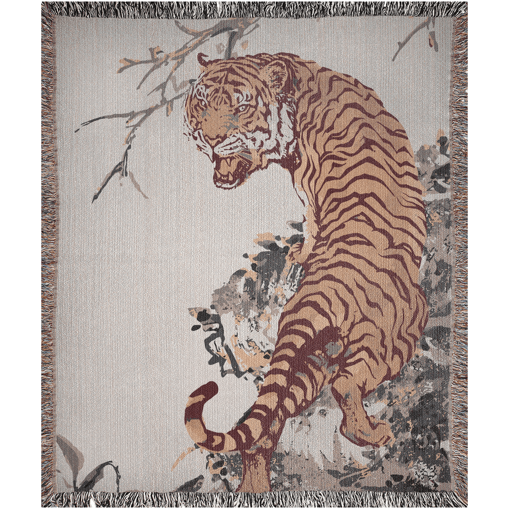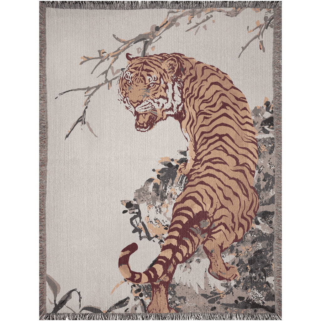 Embrace the majestic beauty of the East with our 100% cotton woven jacquard loom blanket, featuring a stunning depiction of vintage Asian tiger artwork. This exquisite piece showcases a vivid orange tiger, agilely climbing over rocky terrain, set against a light cream background, evoking the essence of traditional Asian art. Ideal for admirers of nature's majesty and the refined beauty of Asian artistic traditions, this blanket transcends its functional use. The powerful imagery of the tiger, a symbol of courage and determination in many Asian cultures, adds a dynamic and inspiring touch to any room. While it serves beautifully as a cozy throw, many have also chosen to display this piece as a tapestry, transforming their living spaces into a gallery of cultural art. Its versatility makes it not just a blanket but a statement piece, inviting both warmth and a sense of adventure into your home.
